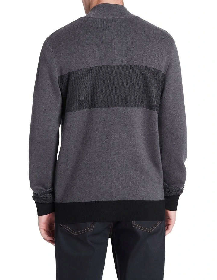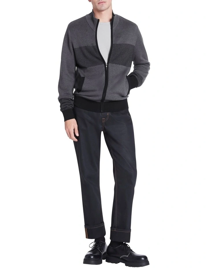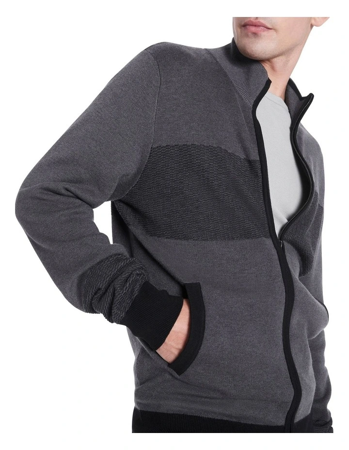An effortless layering piece perfect for winter, this long sleeve knit cardigan is offered in easy-to-pair charcoal grey, accented with darker grey textured panelling and black trim detailing. Featuring a zip-through front with soft stand collar, the cardigan is completed by pocketing at the waist and soft rib trim at the cuffs and body hem.