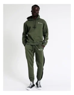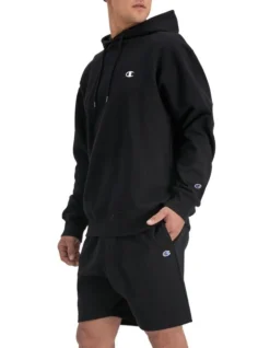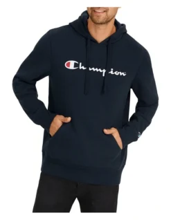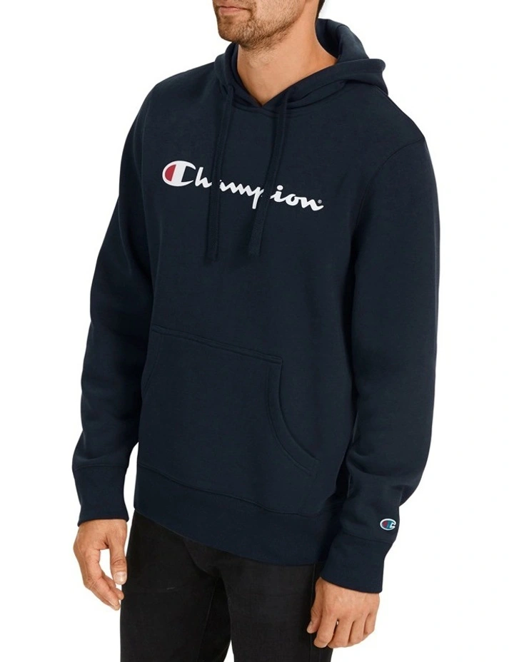 Champion Script Hoodie. Rib sleeve cuff and hem band