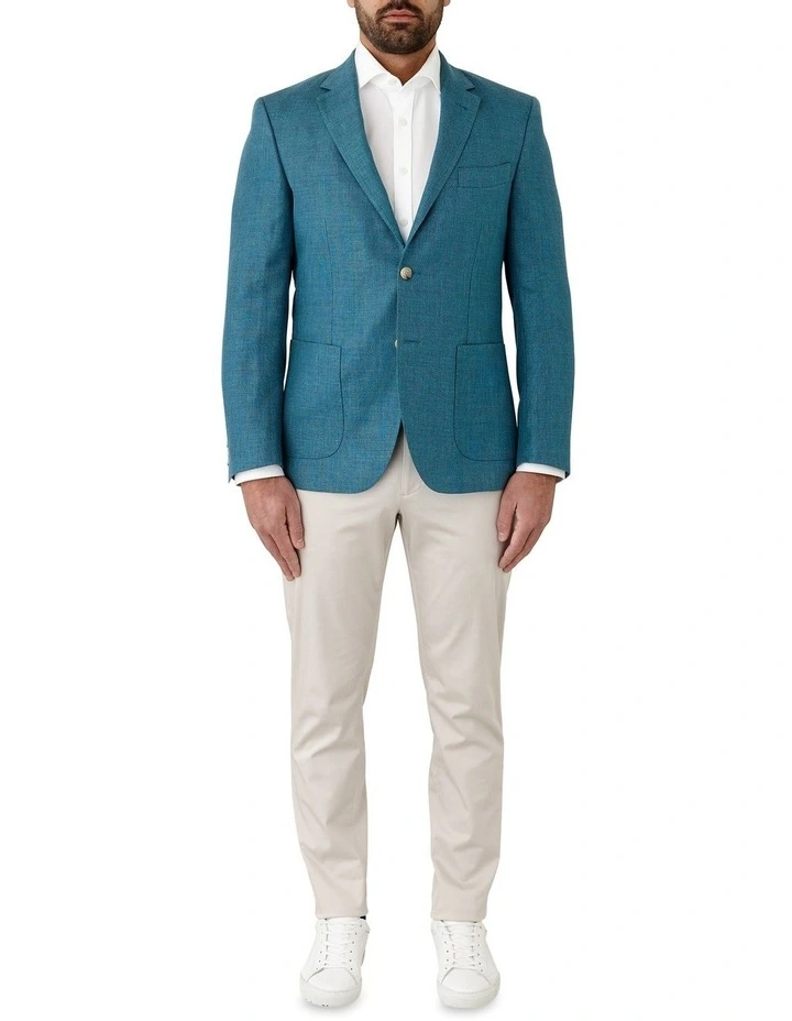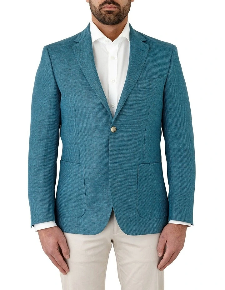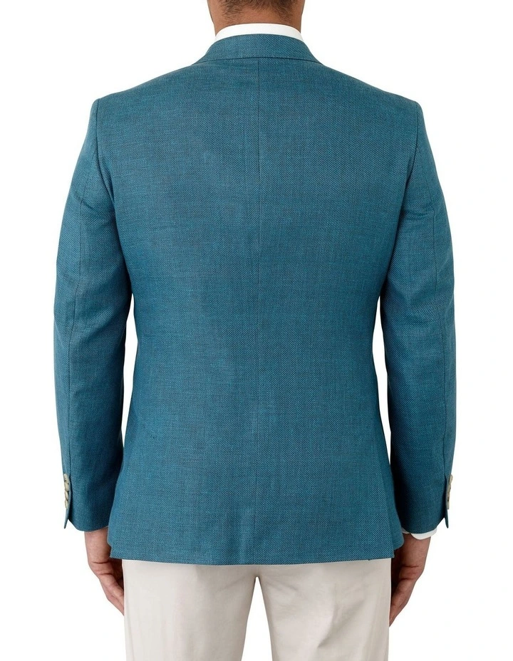 A raised textured twill construction with a polished finish in a teal colour. A unique jacket that would be a wonderful addition to any wardrobe. Can be worn with stone, grey, navy or blue trousers/chinos a perfect summer evening jacket for any occasion. Also available in Blue