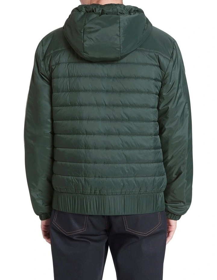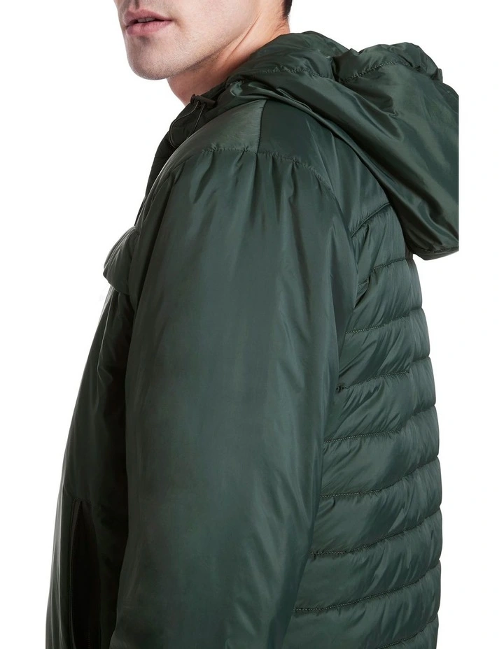 Gorgeous in green, this dark green jacket creates a comfortable, regular fit, finished with quilted puff shaping through the back and cased elastic trim at the cuffs and body hem. Fastening at the front with a full zip closure, the jacket also features a full hood with elasticated toggle drawstrings, and zipped pocketing at the chest and waist.
